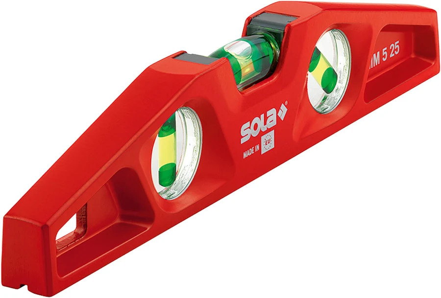 Alumíniumöntvény vízszintmérő, mágnessel 250mm, három SOLA-Focus libellával mart, V-horony, 45°-os libellával