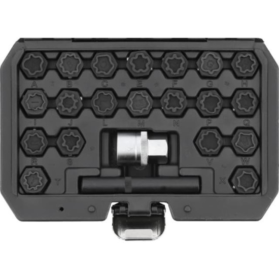 Csavarrögzítő aljzatkészlet, amely a legtöbb 2002-2012-es Audi járműhöz alkalmas.- szerszámtartó mérete: 1/2" (12,7 mm)- aljzatméretek: A, B, C, E, F, G, H, I, J, L, M, N, P, Q, R, S, T, V, W, X- anyaga: CrMo- oxidált felület- 22 db egy készletben