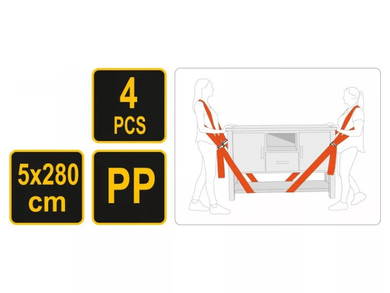 Szíjak, készült tartós polipropilén szövetből. Bútorok vagy más nehéz eszközök szállítására tervezték, például költözéskor. A szíjakat, a modelltől függően, a hátunkon/hám szerűen/ vagy az alkarunkon viseljük, nagyban megkönnyítik a nehéz, nagyméretű tárgyak áthelyezését, csökkentik a fáradságot, és növelik a munkabiztonságot, miközben megvédik a szállított bútort a sérülésektől. A széles modellválaszték lehetővé teszi, hogy a jelenlegi igényekhez legjobban illő szíjakat válasszuk. Méretek: 5 x 280 cm. A csomag 2 szíjat tartalmaz - acél tárolóval és acél csatokkal a hátunkon viselt, valamint 2 teherbíró szíjat. Három csatlakozási lehetőség /hossz/ /hossz/. Nehéz eszközök, például bútorok szállítására, költözéskor.