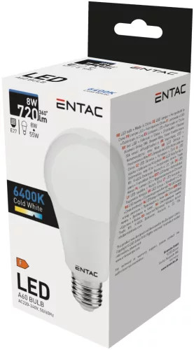 • Entac LED Globe E27 8W CW 6400K  8 W teljesítmény, 720 lm fényáram, IP20 védelem.