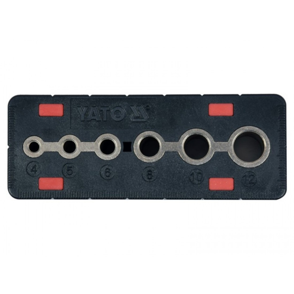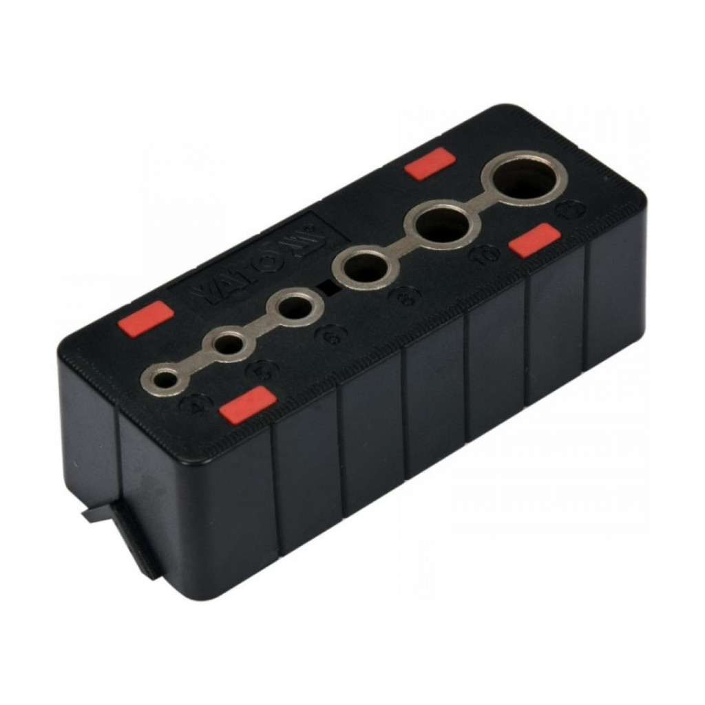 Praktikus eszköz, amely lehetővé teszi gyorsan és precízen lyukak fúrását.- tartós műanyagból (ABS)- 5 furat szénacél vezetőkkel 4, 5, 6, 8, 10 és 12 mm átmérőjű fúrókhoz- "V" alakú horony az alapban, amely megkönnyíti a csövek és sarkok átfúrását- az oldalvonalak lehetővé teszik a lyukak pontosabb elhelyezését- A csúszásgátló kiemelkedések garantálják a szilárd fogást és korlátozzák a fúrt anyagon való csúszást.