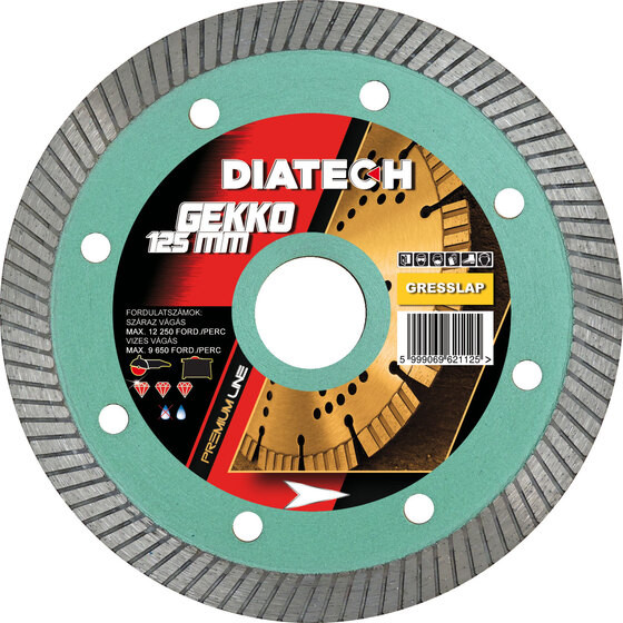 Szinterezett, turbó vágótárcsaA Gekko speciális turbó élű gyémánt vágótárcsa, melynek közel folyamatos élét greslapok vágására fejlesztették ki. A tárcsa 115, 125 mm-es méretben csupán 1,2 mm vastag, így nagyon finom, precíz vágást tesz lehetővé. A vékony alaptest miatt kizárólag egyenes vonalú vágásra alkalmas. Kisebb átmérő esetén (115, 125 mm) akár szárazon is használható, de 125 mm-nél nagyobb méretben feltétlenül szükséges a vízhűtés. A felfogatásnál megerősített acél alaptest stabil, egyenletes vágást biztosít, a tárcsa helyes felhasználás mellett nem deformálódik vagy törik.