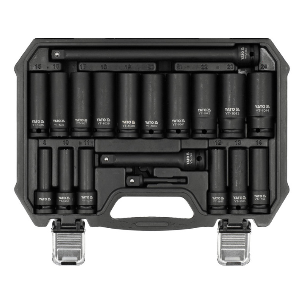 - 16 darab 1/2" hatszögű dugókulcsfej méretekben: 8, 10, 11, 12, 13, 14, 15, 16, 17, 18, 19, 20, 21, 22, 23, 24 mm