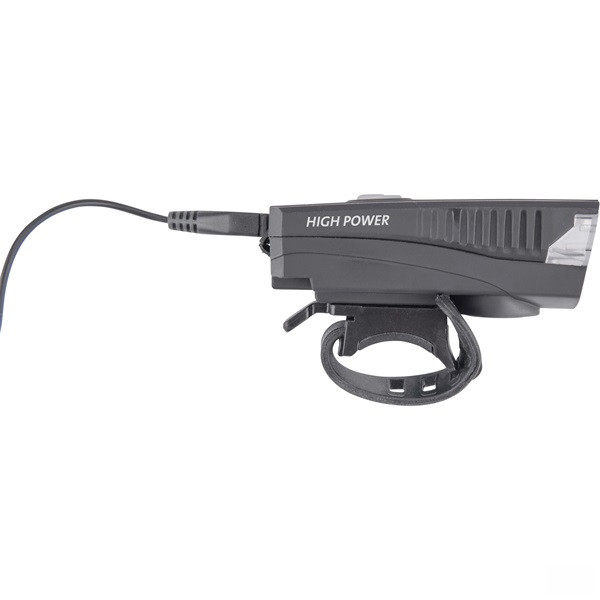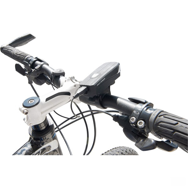 LED lámpa, biciklis, első, fehér 5 W LED; 350 Lm, ABS ház, USB újratölthető beépített Li-ion akku, 1200 mAh, duda funkc.