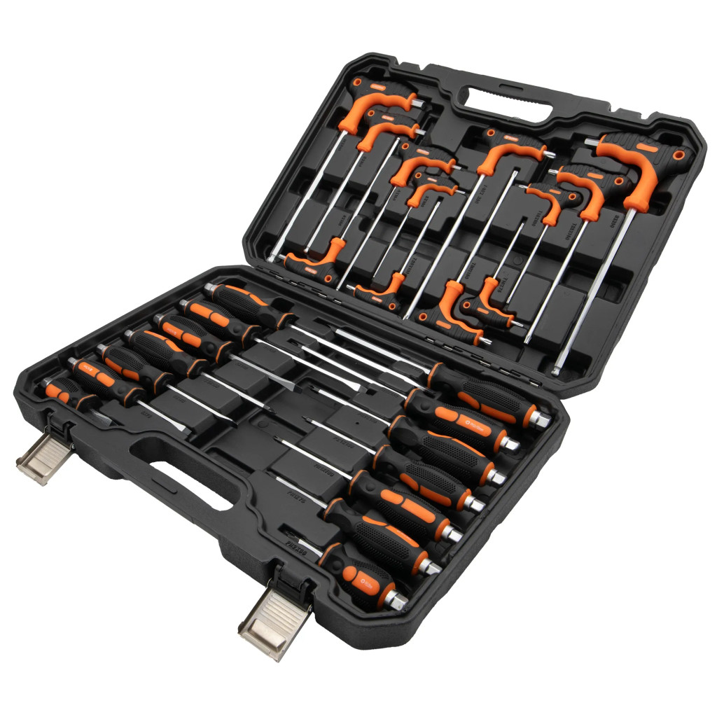 Ez a 26 részes prémium csavarhúzó készlet komplett megoldást biztosít minden finommechanikai és nagy igénybevételű szerelési feladathoz. A lapos, Phillips (PH), Pozidriv (PZ), imbusz (hex) T-fogantyús és Torx T-fogantyús csavarhúzókat tartalmazó összeállítás ideális autószerelők, villanyszerelők és általános karbantartási munkákhoz.