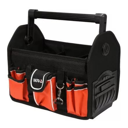 YATO Szerszámtáska csővázas 17 zsebesNagy, nyitott szerszámtáska, 600 D műanyag poliészterből , tartály alja megerősített, nedvességálló szerkezettel. Tehát olyan helyeken használható, ahol kevésbé kellemes munkakörülmények vannak. Fő varratok és zsebek nagy teherbírású változatban. Az alumíniumcsőből készült központi fogantyú puha csúszásmentes fedéllel ellenáll a nagy terheléseknek és stabilizálja a tartály alakját.17 különböző méretű és rendeltetésű zsebbel van felszerelve . A nyitott tárolóprofil lehetővé teszi a tárolt eszközök gyors elérését. A szerszámok, kéziszerszámok és tartozékaik közvetlenül a munkahelyre történő átvitelére tervezték.Jellemzők:- Méretek : 330 x 210 x 335 mm- Védettség: megerősített vízálló alj- Anyag: 600d poliészter- Súly [g]: 2167- Mechanikai szilárdság: megnövelt acélszegecsek- Szín: fekete, piros- Alkalmazás: univerzális