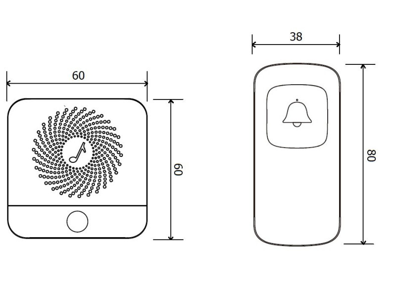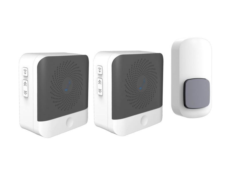 UltraTech csengő, kinetikus, 2db beltéri egységgel, vezeték nélküli, jelzőfénnyel, 150m, 230V, dugaszolható, IP55-ös nyomógombbal, 58 féle dallam, szürke-fehér