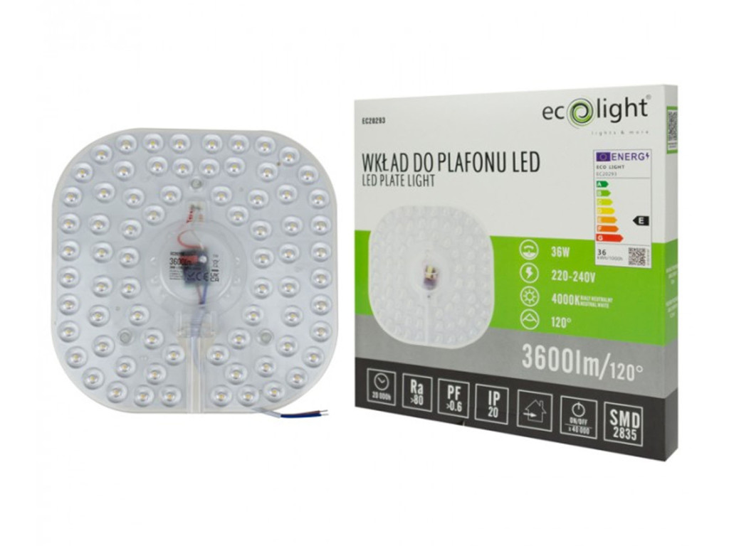 Az Ecolight beépíthető LED lámpabetétek kiváló megoldást kínálnak beltéri világításhoz. A 36 watt teljesítményű változat 4000K-es, természetes fehér fénnyel, 3600 lumen fényárammal biztosít erős megvilágítást. IP20-as védettség révén csak beltéri helyiségekben használható. A mágneses rögzítés gyors és egyszerű telepítést tesz lehetővé.