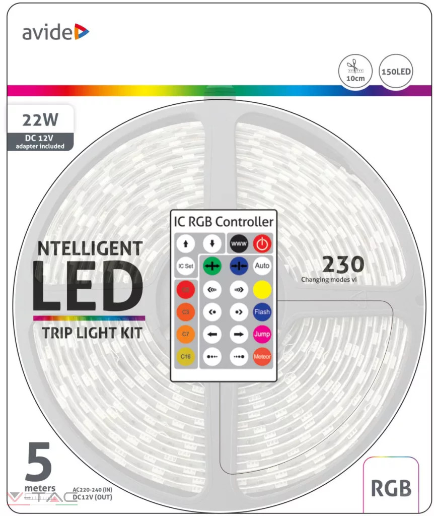 Avide LED Szalag Bliszter 12V 22W SMD5050 30LED címezhető IC RGB IP65 5m + Prg.távirányító