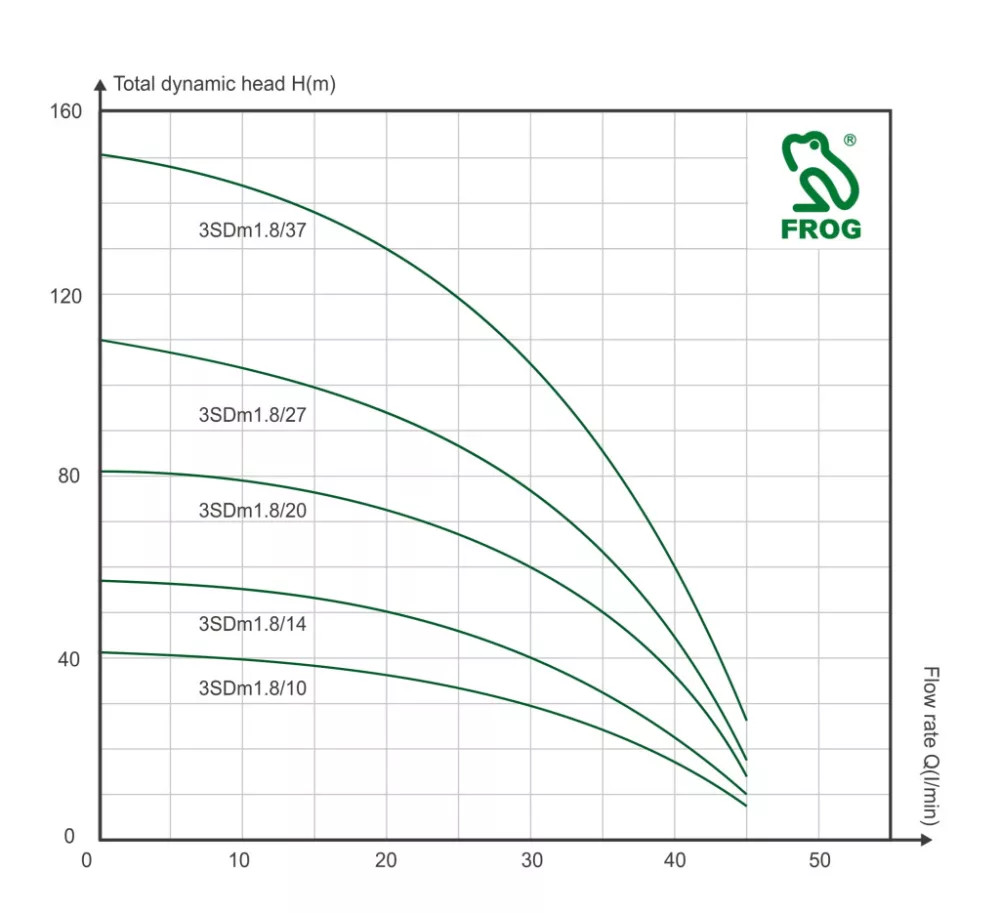 A FROG 3SDm 1,8/14-0,37 szivattyú maximális vízszállítása 1,5 m³/h (25 liter/perc), vagy akár 47 méter magasságra is képes emelni a vizet. Az olajjal hűtött, újratekercselhető motor 0,37 kW-os teljesítményt nyújt, és egyfázisú, 220–240 V/50 Hz áramellátásra tervezték. A motor IP68 védelemmel rendelkezik, így teljes mértékben vízálló. A szivattyú max. 80 méter mélységig meríthető, és a víz homoktartalma nem haladhatja meg a 0,3%-ot. A hőmérsékleti határérték pedig 35 °C.